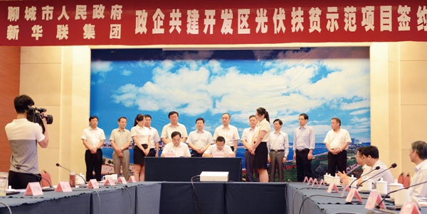 2016年6月23日,集團與聊城市政府共同建設的光伏扶貧示范項目在聊城市會議接待中心舉行簽約儀式。聊城市委副書記陳平, 副市長郭建民,市委副秘書長、市扶貧辦主任許蘭嶺,市政府副秘書長周兆巖,市經濟技術開發區黨工委書記兼管委會主任楊廣平,集團黨委書記、副總裁丁偉,集團助理總裁、工會主席兼企業文化部總監楊運輝,集團助理總裁、山東新華聯新能源公司董事長兼總經理毛自力,集團財務部總監高大鋼及聊城市市直部門、經濟技術開發區有關部門,山東新華聯新能源公司、山東新華聯智能光伏公司的相關負責人出席儀式。郭建民副市長主持簽約儀式。